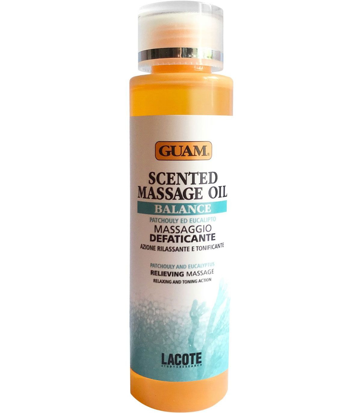 Ароматическое массажное масло Guam Balanca со сладко-пряным ароматом и драгоценными эфирными маслами пачули и эвкалипта придает коже ощущение комфорта. Оно делает ее сияющей, подтянутой и более молодой.