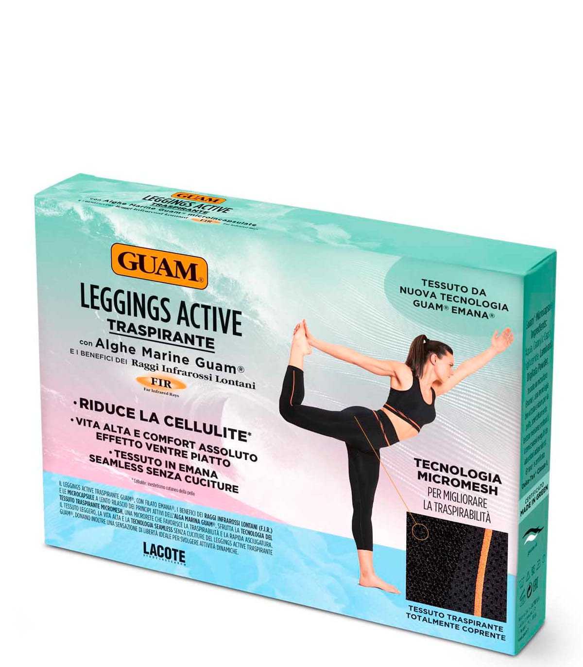 Для разработки этой модели леггинсов была использована специальная технология Micromesh, которая смогла обеспечить «дышащий» эффект. Это обеспечивает особый комфорт и быстрое высыхание ткани во время тренировок. Леггинсы Guam Active имеют высокую талию, сделаны из легкой комфортной ткани и имеют только внутренний плоский шов.