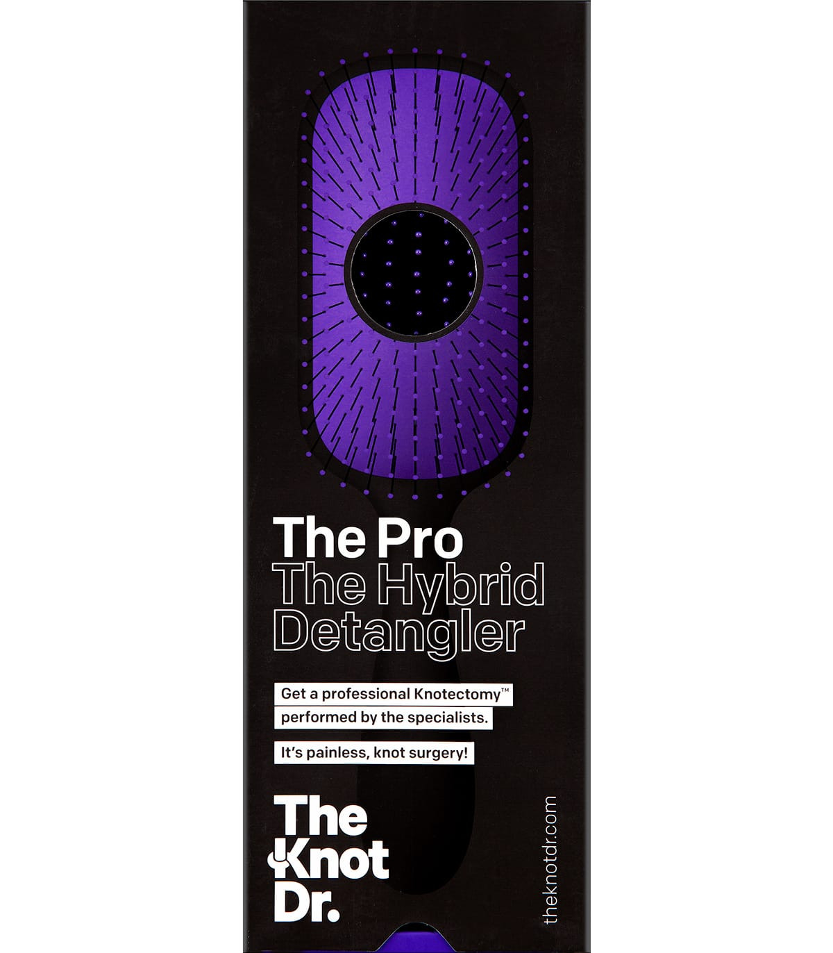 The Knot Dr. Pro - це гребінець з 212 щетинками. Унікальне розташування цього вражаючого кількості щетинок по щітці забезпечує максимальне покриття та дарує приємні відчуття при розплутуванні волосся. Вона має гладкий чорний прогумований корпус з яскравими вставками на кінчиках щетинок.